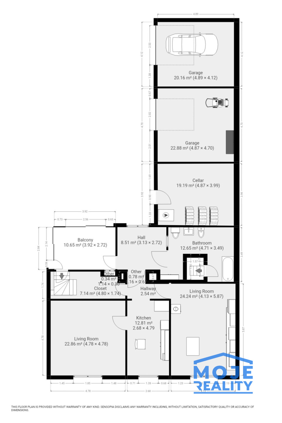 Hospodářská část domu nabízí dvě garáže s vjezdovými vraty a několik dalších místností, které lze využít jako sklady, dílny, letní kuchyň nebo ponechat v původním stavu jako chlívky pro drobná zvířata.
