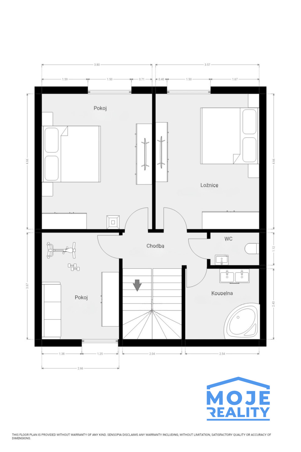 Podkroví: ložnice, dva dětské pokoje, koupelna s vanou a samostatné WC. Dřevěné schodiště dodává prostoru útulný charakter.